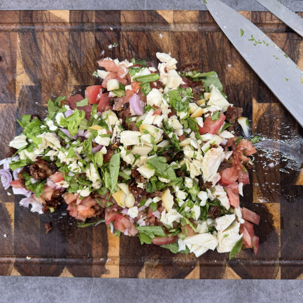 Using a sharp chef's knife, carefully chop through the mixture on the cutting board, combining all the ingredients into a finely chopped salad. This method allows the flavors to meld together.