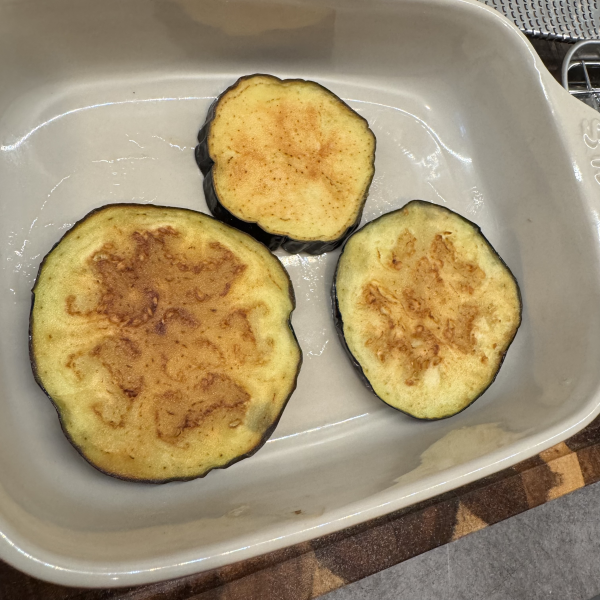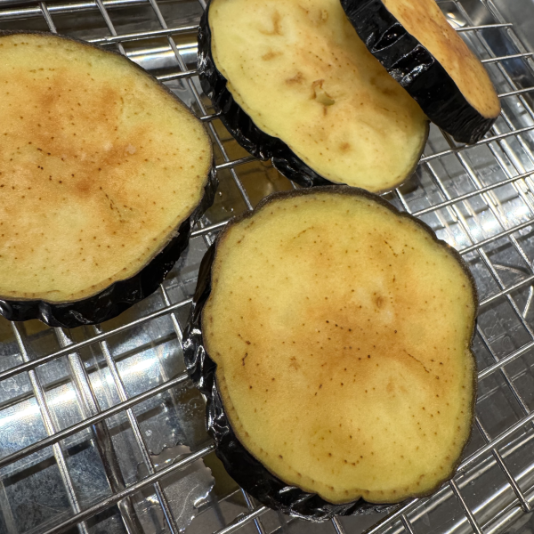 Slice the eggplants into about 1 cm thick rounds. Lay the slices on a baking sheet and sprinkle both sides with salt. Let them sit for about an hour to draw out bitterness. After an hour, rinse the eggplant slices with water and pat them dry with paper towels. -