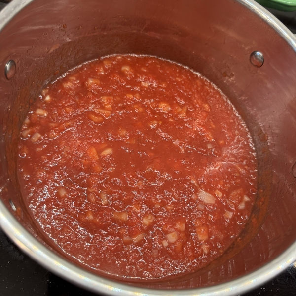 In a saucepan, heat a bit of olive oil over medium heat. Add the minced garlic and cook until fragrant, about 1 minute. Pour in the tomato sauce, season with salt and pepper, and add a handful of torn basil leaves. Simmer for 10-15 minutes.