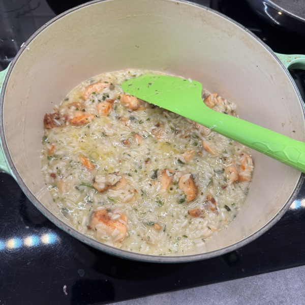 Once the risotto is done, gently fold in the cooked salmon, adding a bit more lemon juice, and adjust the seasoning with salt and pepper.