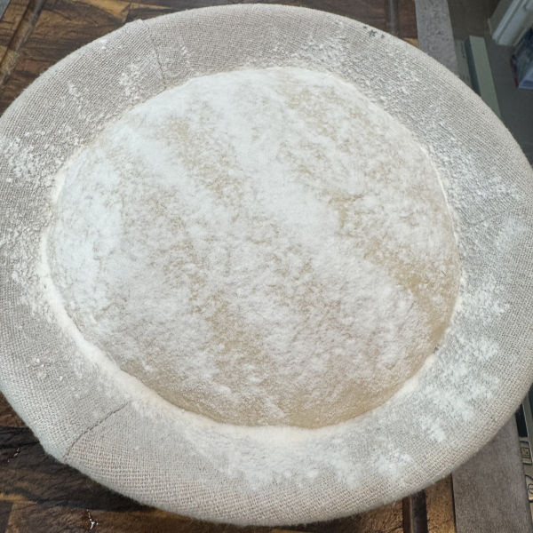 After the bulk fermentation, gently shape the dough into a ball and place it seam-side up in a well-floured banneton (bread proofing basket). -